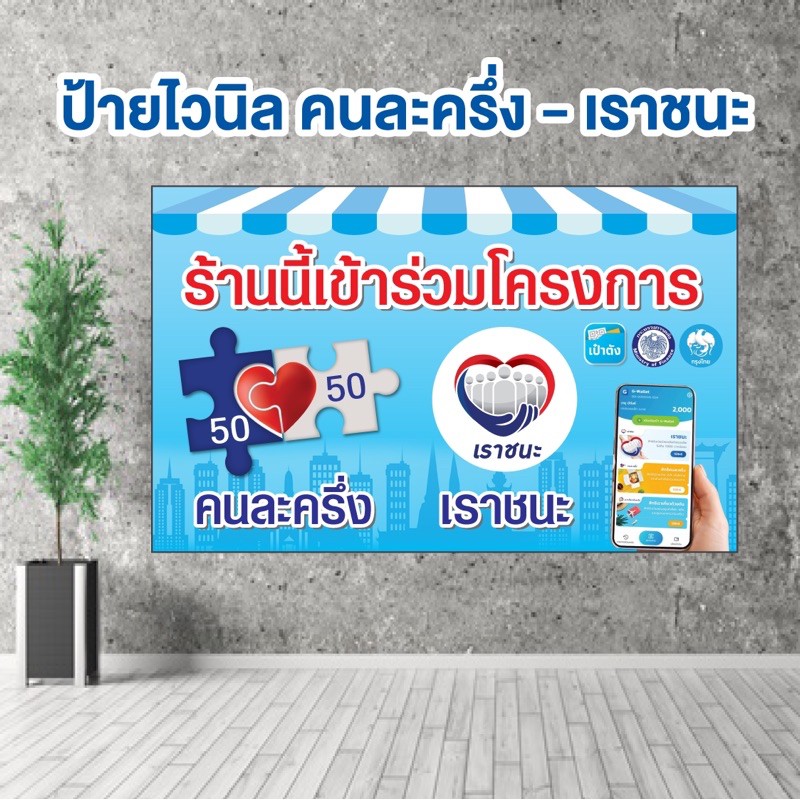Servicing to make vinyl signs size 30 × 30 cm 45 b. ป้ายไวนิล โครงการ เราชนะ / เรารักกัน/ คนละครึ่ง 50/50 / ประชารัฐ (แพ็คสินค้า. สำหรับ ร้านค้าที่อยากร่วมโครงการเราชนะ จะต้องมีเงื่อนไขพร้อมคุณสมบัติร้านค้าที่มีสิทธิ์เข้าร่วมโครงการ เราชนะ ว่าแต่มีอะไรบ้าง ไปดูกัน สำหรับ ร้านค้า ที่ต้องการเข้าร่วมมาตรการเราชนะในครั้งนี้ กรุงเทพธุรกิจออนไลน์ จะพาไปไขข้อข้องใจประเด็นข้อสงสัยต่างๆ. น.ส.กุลยา ตันติเตมิท โฆษกกระทรวงการคลัง เปิดเผยแนวทางการเปิดรับลงทะเบียน โครงการเราชนะ สำหรับประชาชนที่ไม่มี.